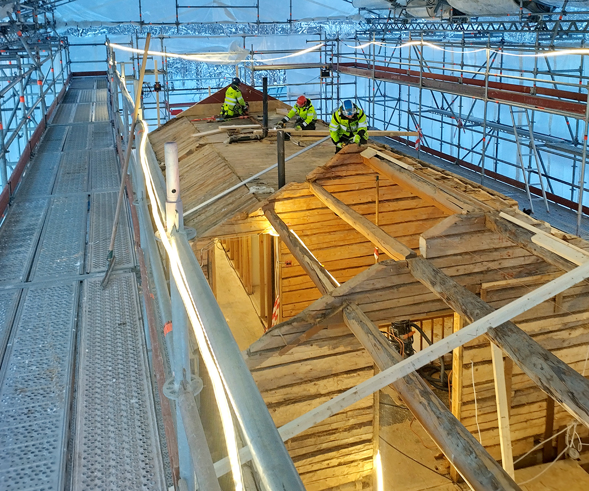 Hemavans Wärdshus råkade förra våren ut för en omfattande brand. Contractor är nu på plats för att rädda upp byggnaden utvändigt…