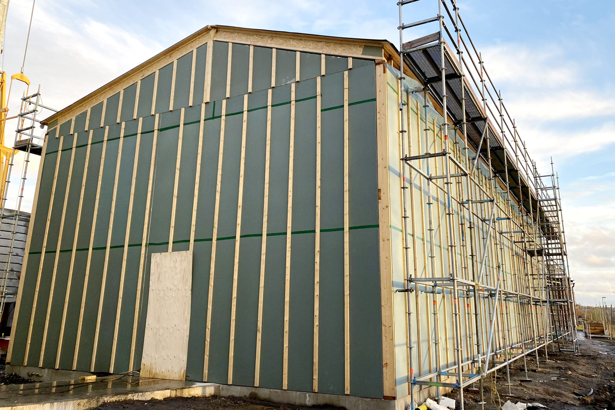 – Det går ganska så bra, vi hade lite struligt med sena leveranser av limträet men vi har nästan jobbat igen den förseningen. Det gäller att skynda långsamt den här tiden på året med regnskurar, snöblandat regn och halka nästan överallt. Noggrannhet vinner i längden och här bygger vi kontor med lite exklusiva inomhusdetaljer så det blir skönt att snart få vädersäkra byggnaden och torka ur innan vi reglar upp innerväggarna, säger Kim.
