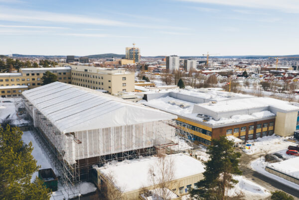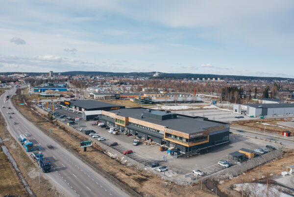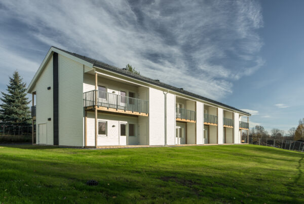 Planritning över gavelfasaden som är gjord med liggande trä, 2 plans radhus.