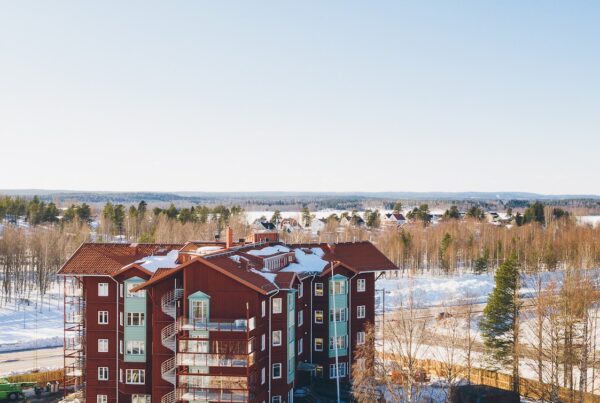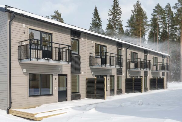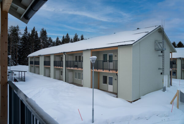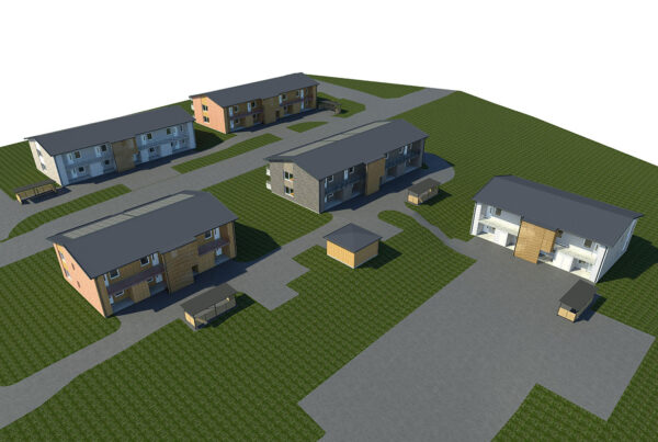 3D bild över radhussling i Ursviken som Contractor bygger. bilden är tagen framifrån huset vid entren, man ser en röd cykel på framsidan